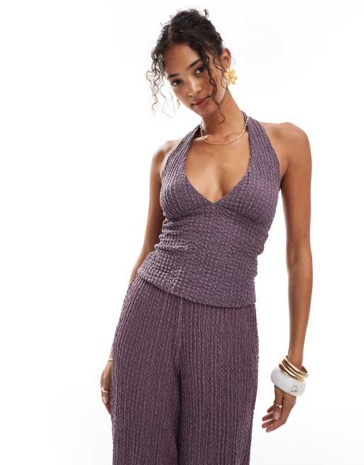Pull&Bear – Fioletowy fakturowany top z dekoltem halter, część zestawu