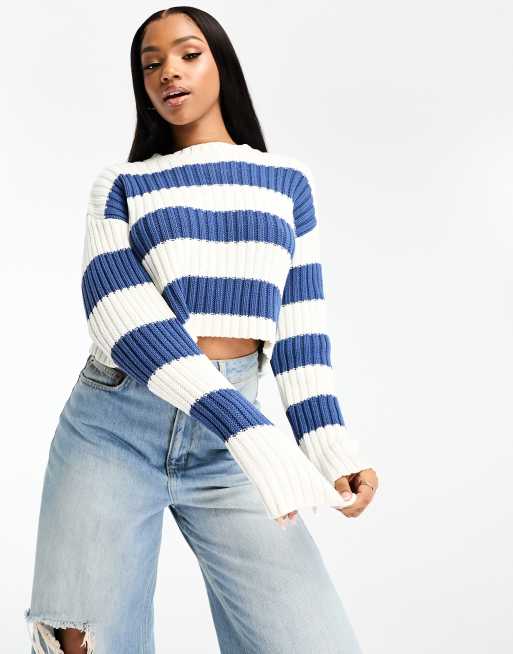 Pull&Bear – Granatowy krótki sweter dzianinowy w paski