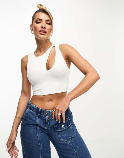 Pull&Bear – Krótki top w kolorze złamanej bieli o fasonie bokserki z asymetrycznym wycięciem