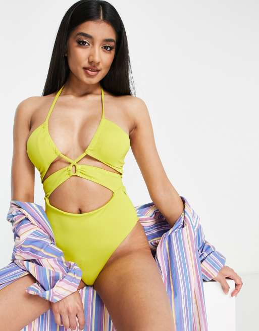 Pull&Bear – Limonkowy wysoko wycięty kostium kąpielowy z dekoltem typu halter i wycięciami