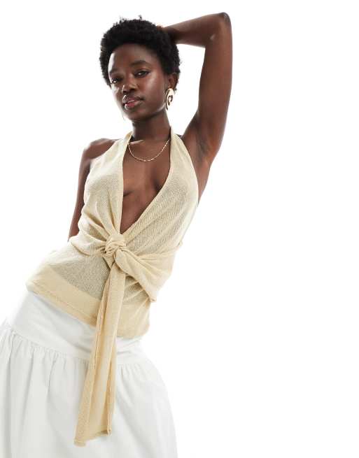 Pull&Bear – Piaskowy dzianinowy top z dekoltem halter i supełkiem z przodu