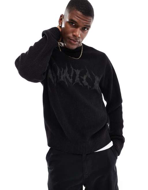 Pull&Bear – Prążkowany czarny sweter z efektem sprania i nadrukiem