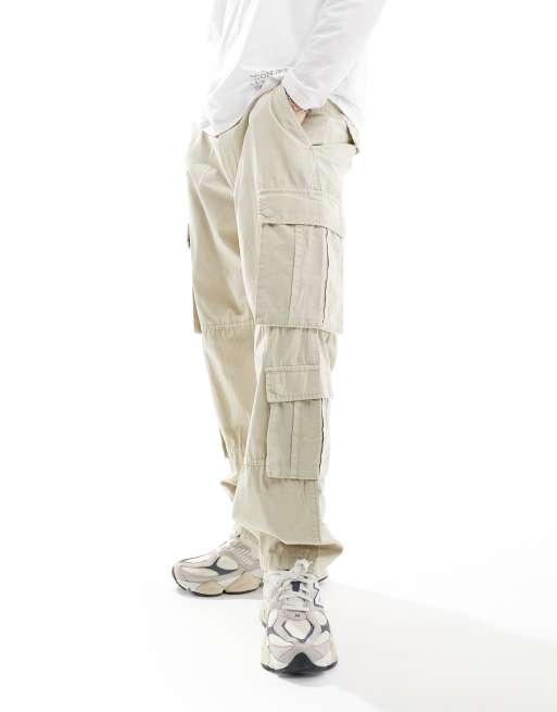 Pull&Bear – Spodnie bojówki z szerokimi nogawkami i kilkoma kieszeniami w kolorze ecru