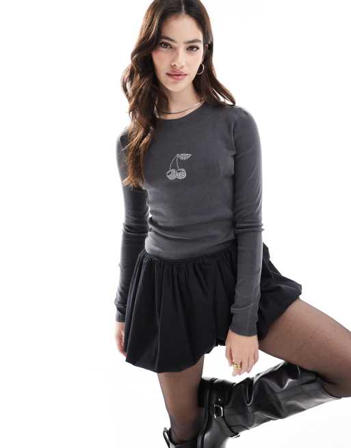 Pull&Bear – T-shirt z długimi rękawami, z grafiką z wiśniami, w spranym kolorze czarnym