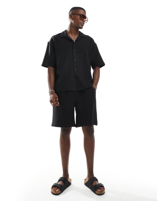 Pull&Bear – Teksturowane czarne szorty z tkaniny frotte, część zestawu