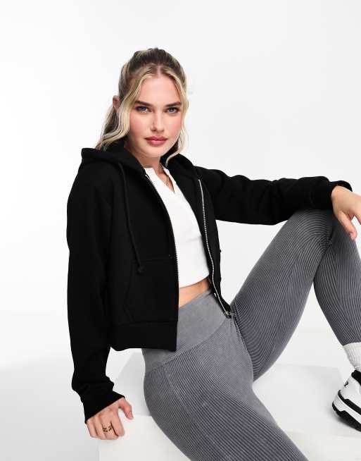 Pull&Bear – Zapinana na suwak czarna bluza z kapturem o krótkim fasonie