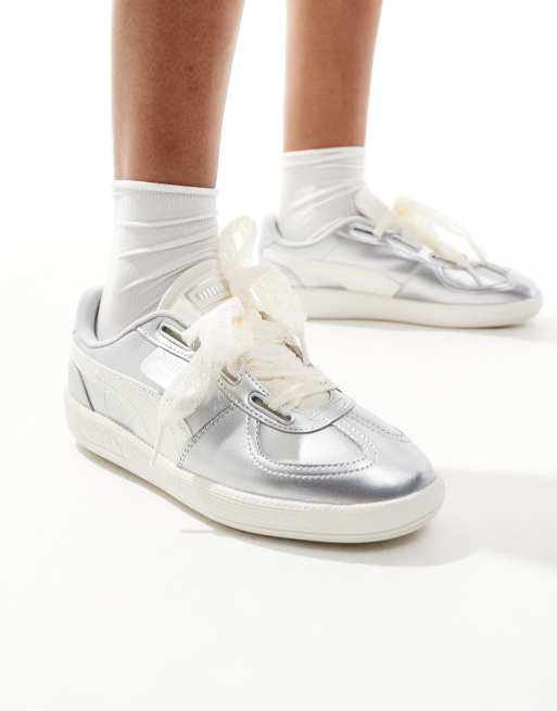 PUMA – Palermo – Metaliczne srebrne buty sportowe ze sznurowadłami ze wstążki