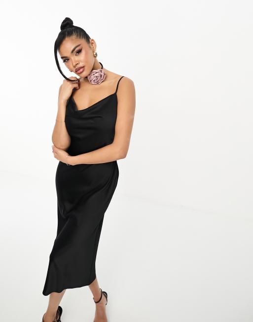 Rare London – Czarna satynowa sukienka midi z chokerem z bukiecikiem