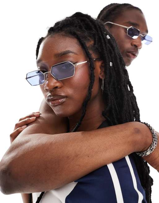 Ray-Ban – Yevi – Srebrne sześciokątne okulary przeciwsłoneczne z niebieskimi soczewkami