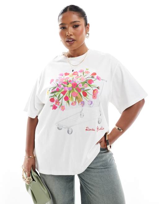 Renee Studio Plus Exclusive – Kremowy T-shirt z okrągłym dekoltem i nadrukiem z taczką z kwiatami