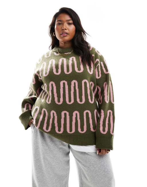 Renee Studio Plus x Holly Wynne Exclusive – Zielony prążkowany sweter z zabudowany dekoltem i różowym abstrakcyjnym wzorem