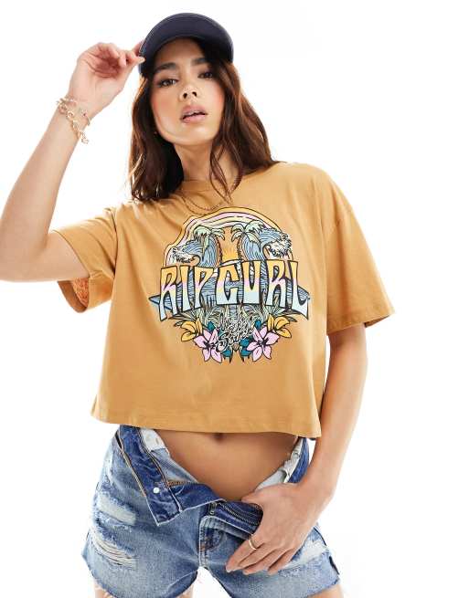 Ripcurl – Musztardowy krótki T-shirt z nadrukiem