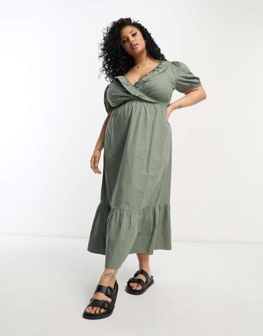 River Island Plus – Popelinowa sukienka midi w kolorze khaki z falbanką