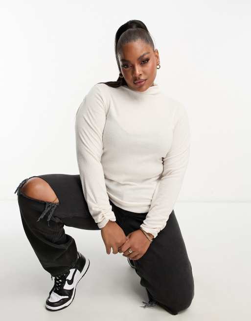 River Island Plus – Prążkowany szczotkowany top z długim rękawem i golfem w beżowym kolorze