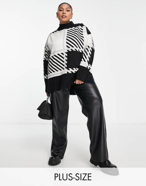 River Island Plus – Sweter w czarną kratkę z guzikami przy szyi
