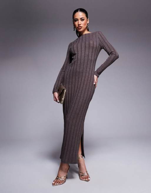 River Island – Brązowa prążkowana sukienka z długimi rękawami