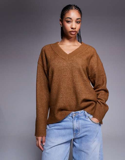 River Island – Brązowy dzianinowy sweter z dekoltem w kształcie litery V