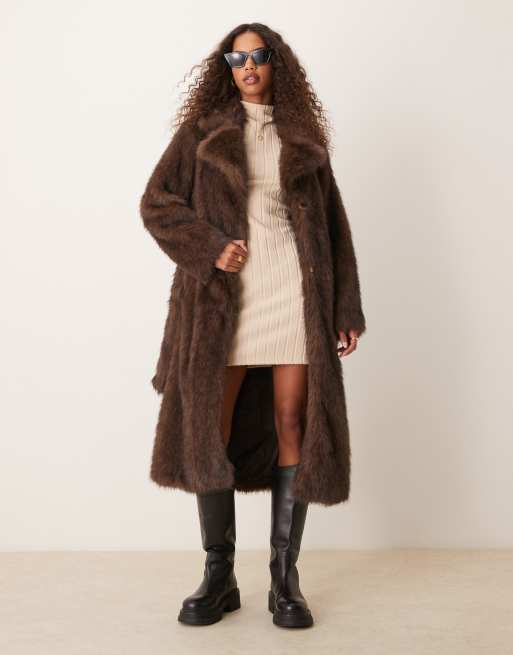 River Island – Ciemnobrązowy długi płaszcz z paskiem ze sztucznego futra