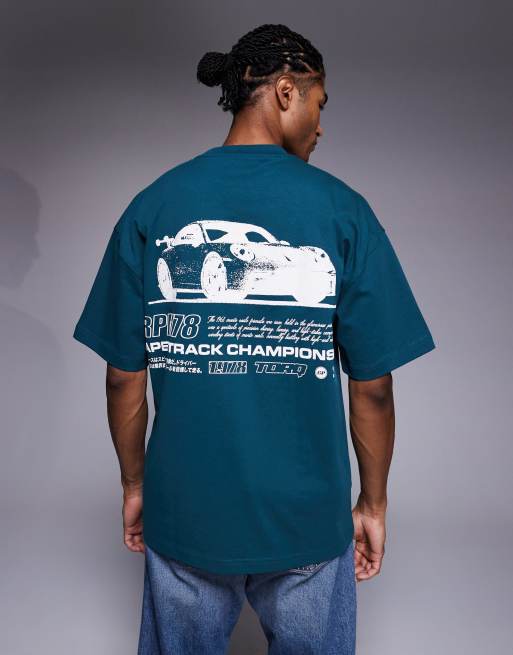 River Island – Ciemnozielony T-shirt z motywem wyścigowym na plecach