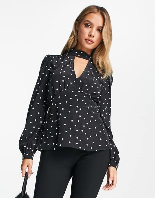 River Island – Czarna kopertowa bluzka w groszki z długim rękawem