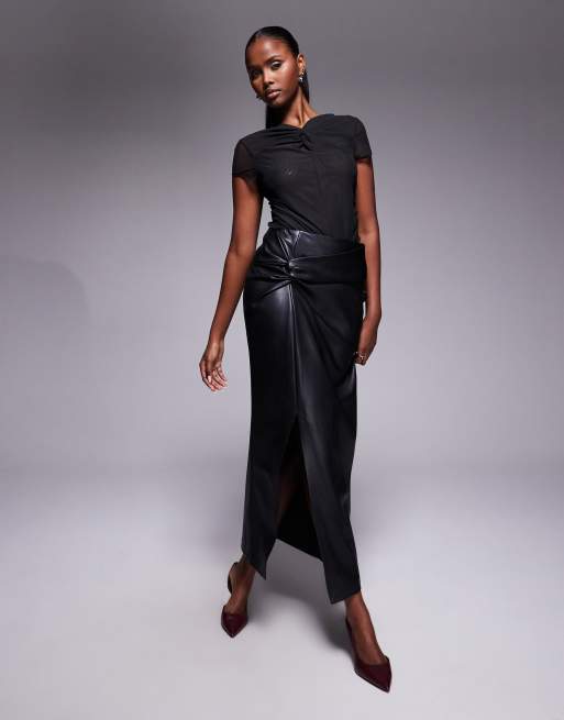 River Island – Czarna spódnica midi z imitacji skóry z ozdobnie skręconym elementem z boku