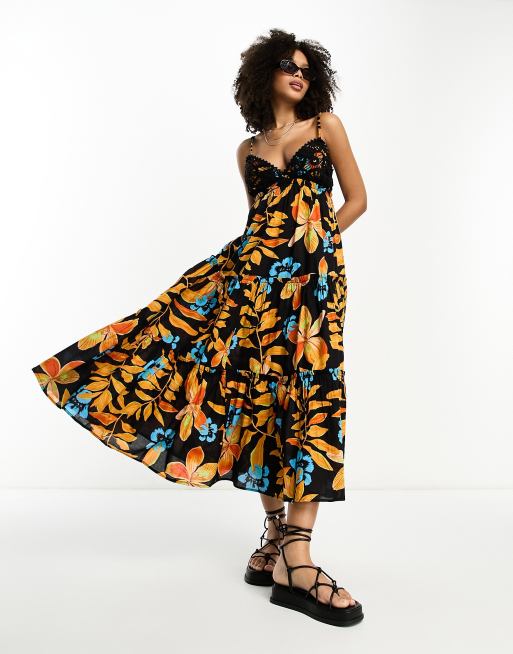 River Island – Czarna warstwowa sukienka plażowa maxi w tropikalny wzór