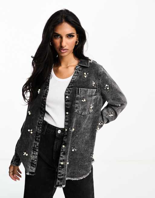 River Island – Czarna zdobiona perełkami koszula jeansowa z efektem sprania