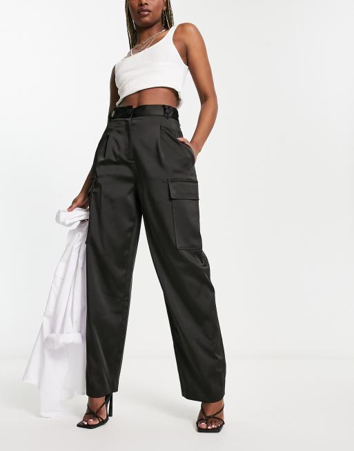 River Island – Czarne satynowe spodnie bojówki w roboczym stylu