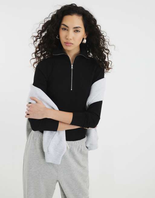 River Island – Czarny prążkowany top z długimi rękawami i zamkiem z przodu