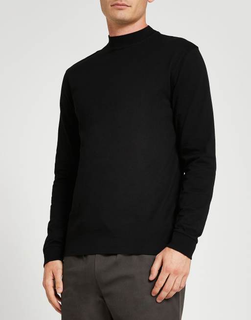 River Island – Czarny T-shirt o dopasowanym kroju z długimi rękawami i półgolfem