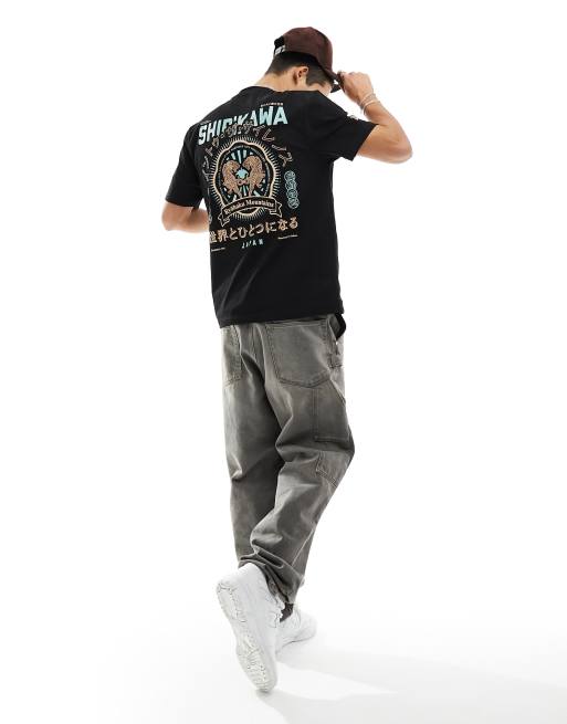 River Island – Czarny T-shirt z nadrukiem z japońskim motywem na plecach