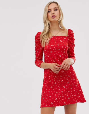 River Island – Czerwona sukienka mini z kwadratowym dekoltem w kwiatowy wzór