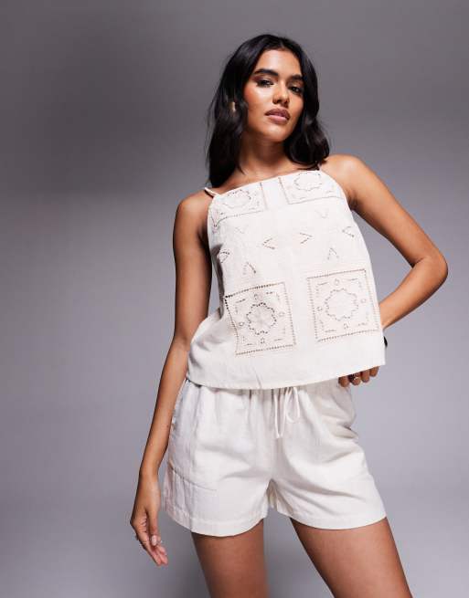 River Island – Jasnobeżowy lniany top bez rękawów z haftem angielskim