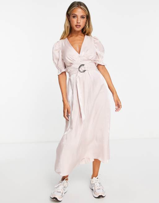 River Island – Jasnoróżowa sukienka midi z paskiem i bufkami