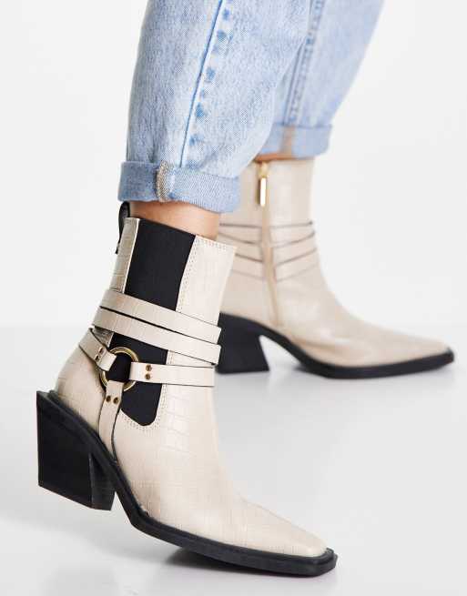 River Island – Kremowe kowbojskie botki na obcasie o fakturze skóry krokodyla