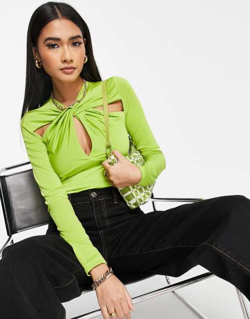 River Island – Limonkowy top z długimi rękawami i skręconym przodem z wycięciami