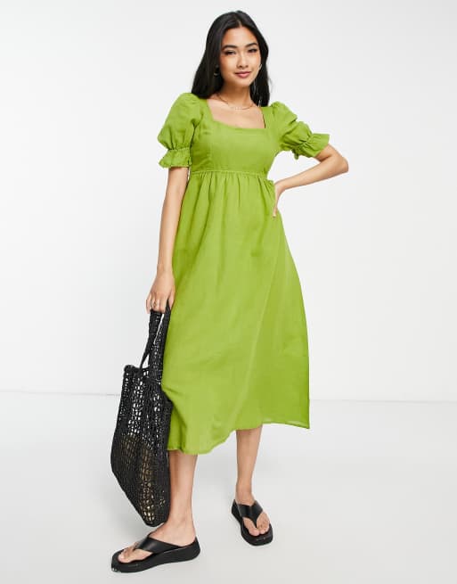 River Island – Luźna popelinowa sukienka midi w kolorze zielonym z bufkami