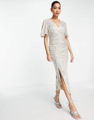 River Island – Srebrna marszczona sukienka midi zdobiona cekinami