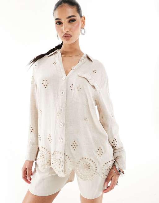 River Island – Szarobeżowa koszula z domieszką lnu z haftem angielskim