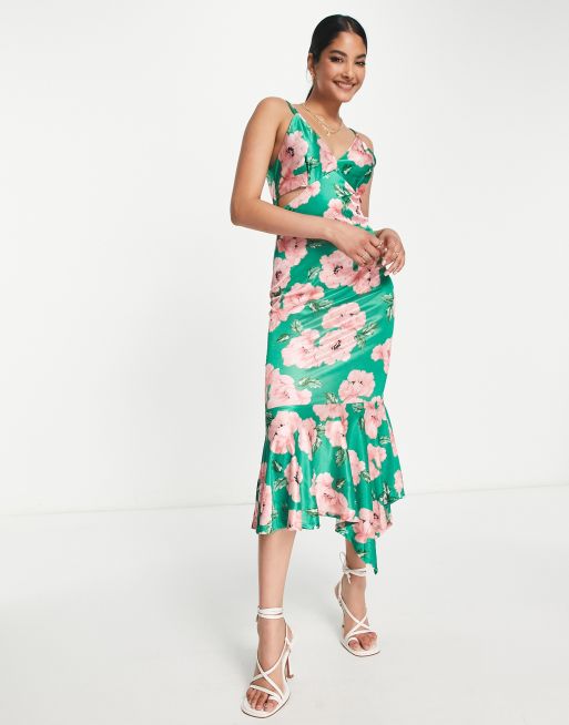 River Island – Zielona satynowa sukienka midi na ramiączkach w kwiaty
