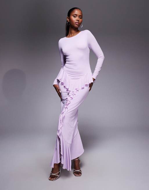 Ruched & Ready – Liliowa profilowana sukienka maxi z długimi rękawami, drapowaniem i falbankami