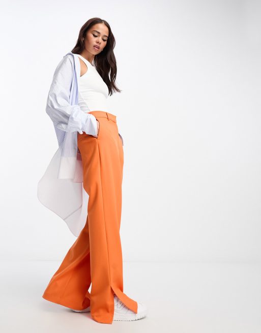 Selected Femme – Jaskrawopomarańczowe dopasowane spodnie z wysokim stanem z fakturowanego diagonalu