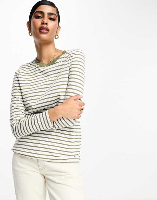 Selected Femme – T-shirt z długimi rękawami w paski w kolorze khaki