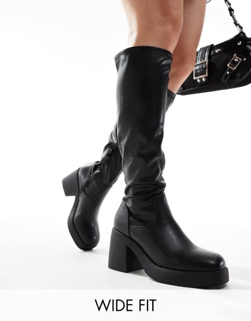 SEQWL Wide Fit – Czarne kozaki na obcasie klockowym z elastyczną cholewką