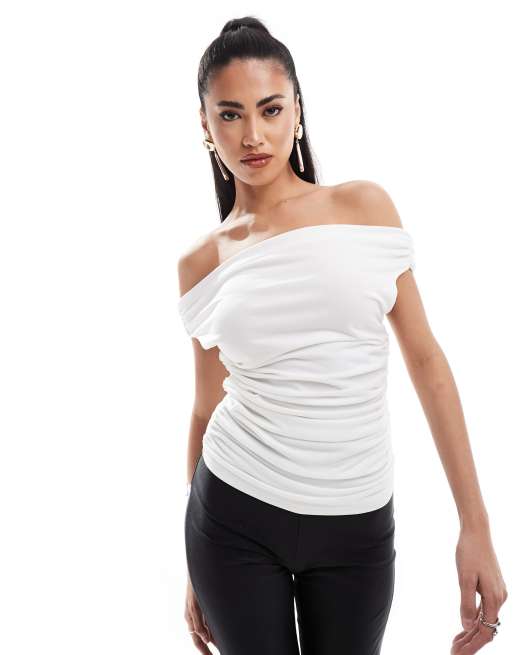 SIMMI – Przylegający biały top bardot z wywijaną górą