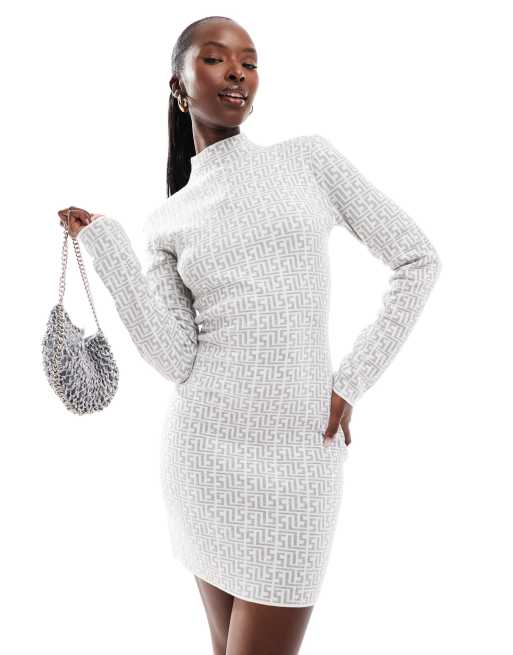 SIMMI – Szara dzianinowa sukienka mini z golfem w geometryczny wzór