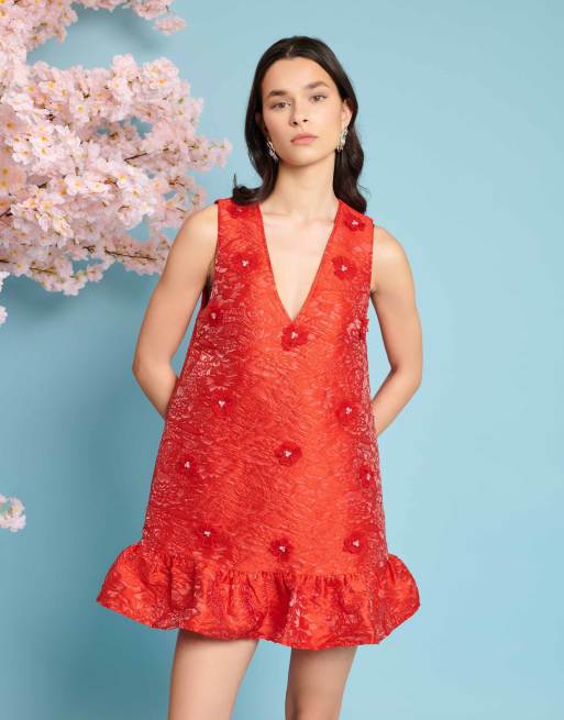 Sister Jane – Czerwona żakardowa sukienka mini z ozdobnymi kwiatkami