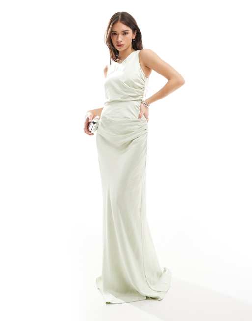 Six Stories Bridesmaid – Miętowa satynowa asymetryczna sukienka maxi z drapowanym dekoltem