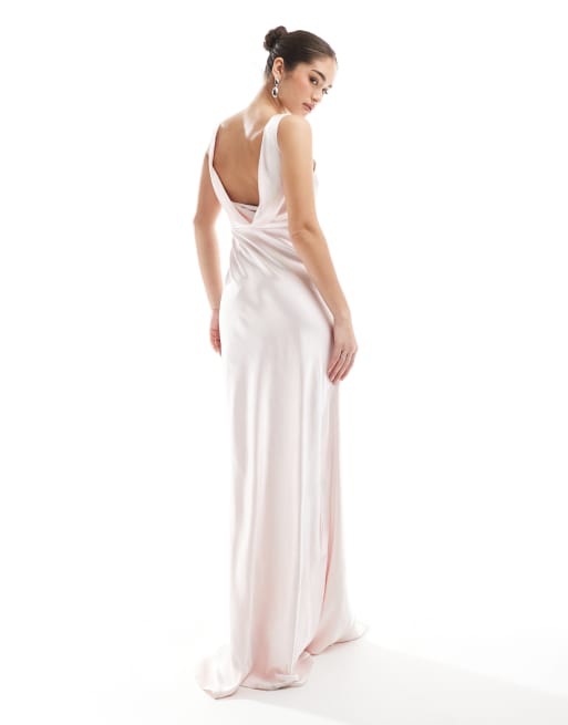 Six Stories Bridesmaid – Pudroworóżowa satynowa sukienka maxi dla druhny z drapowanym tyłem