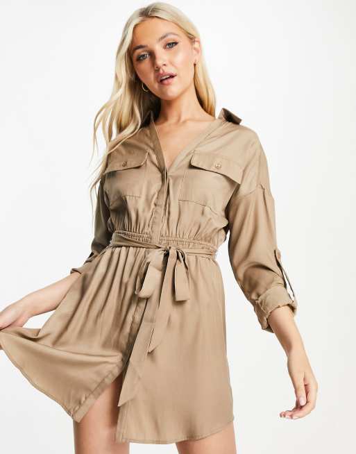 Skylar Rose – Sukienka mini w kolorze taupe z wiązaniem w talii i kieszeniami